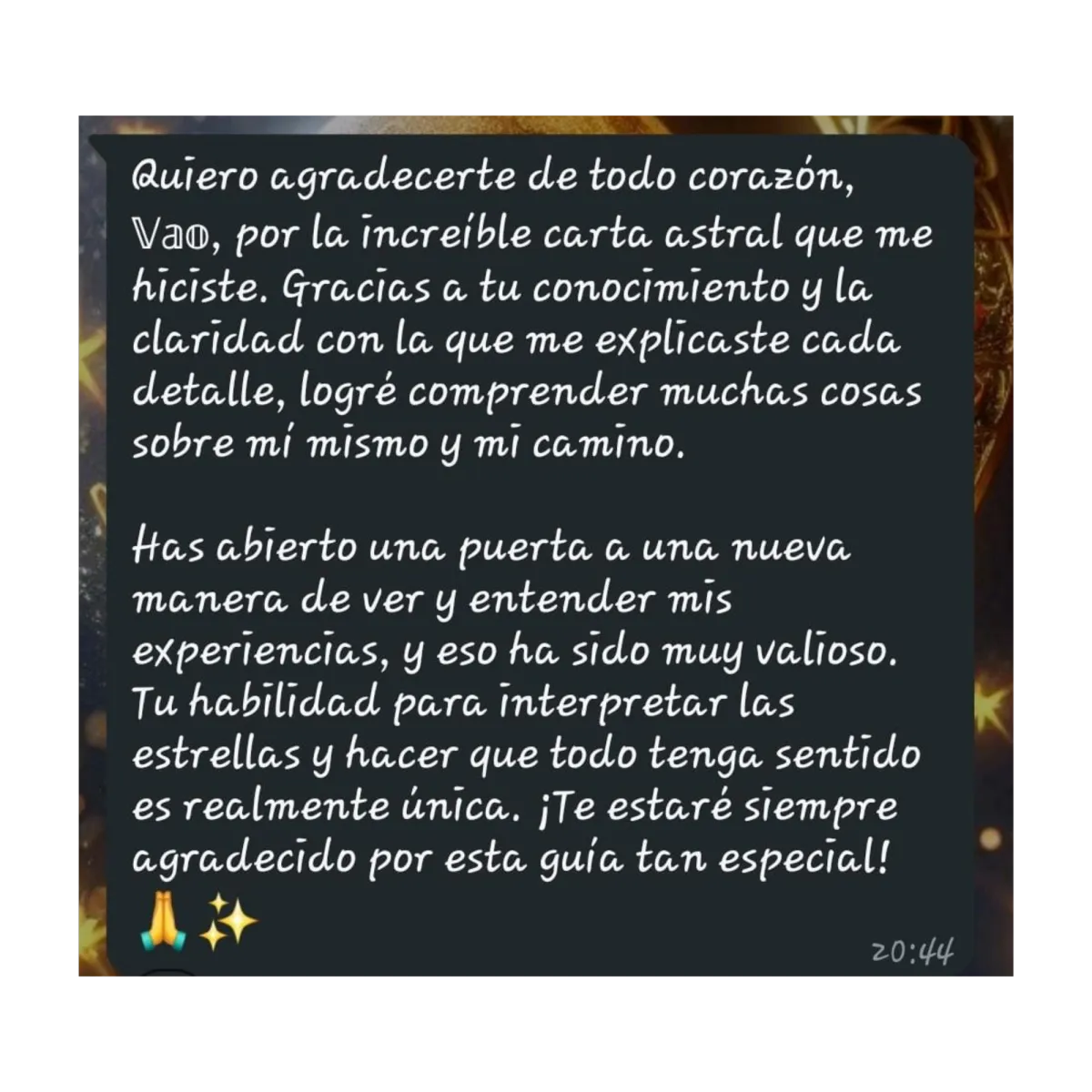No creo ni promuevo soluciones mágicas para resolver problemas de la noche a la mañana. Tampoco puedo prometer resultados específicos y es importante advertir que los testimonios no son representativos de lo que podría experimentar cualquier persona que utilice mis servicios. Los resultados pueden variar y es posible que no se obtenga ningún resultado concreto, especialmente si no se reflexiona y aplica lo aprendido durante nuestras sesiones. Es fundamental entender que la astrología no es un arte adivinatorio, sino una herramienta de autoconocimiento y orientación.